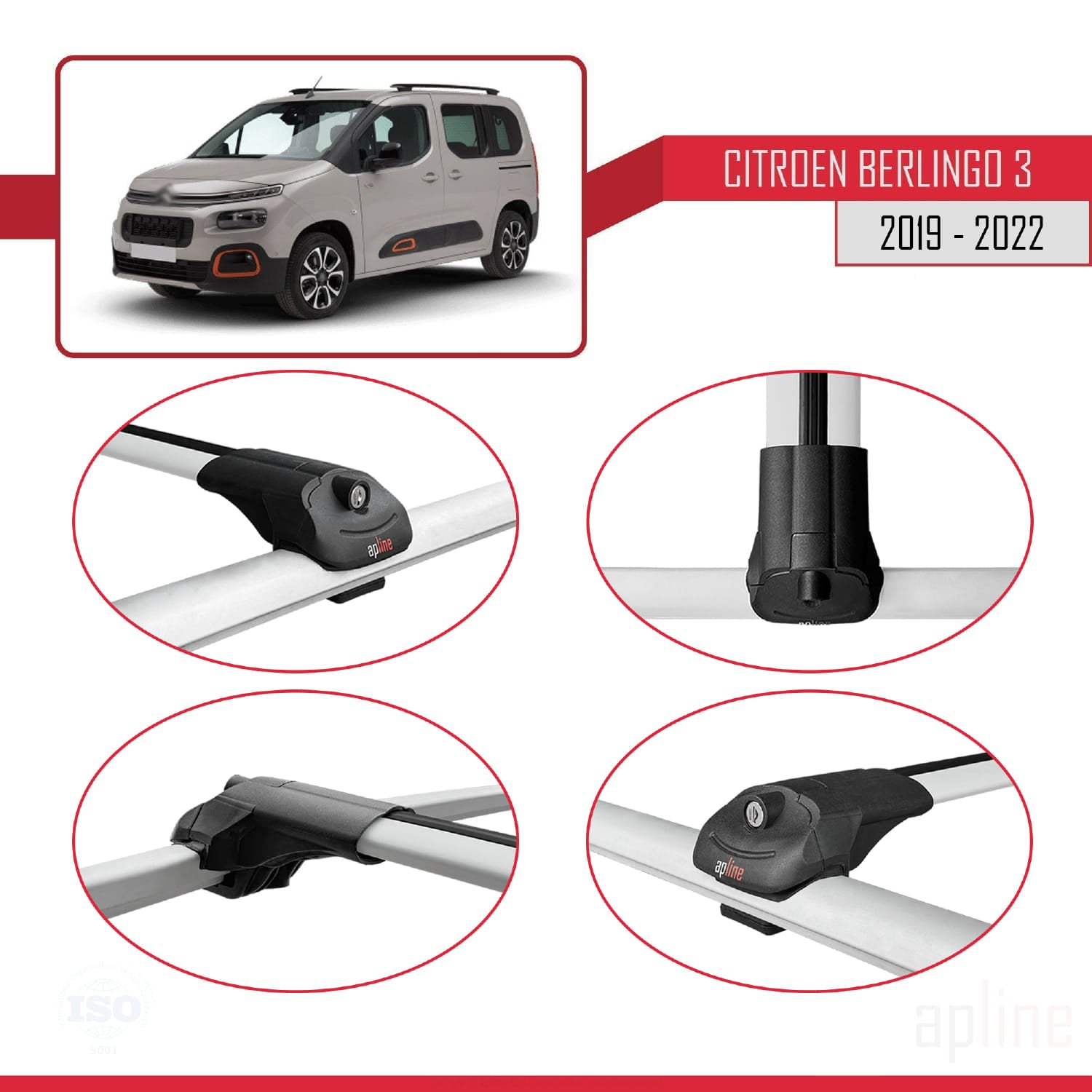 Kompatibel mit Citroen Berlingo 3 (K9) 2019-2022 ACE-1 Dachgepäckträger, Reling, Gepäckträger, graues Aluminium, 4 Stangen