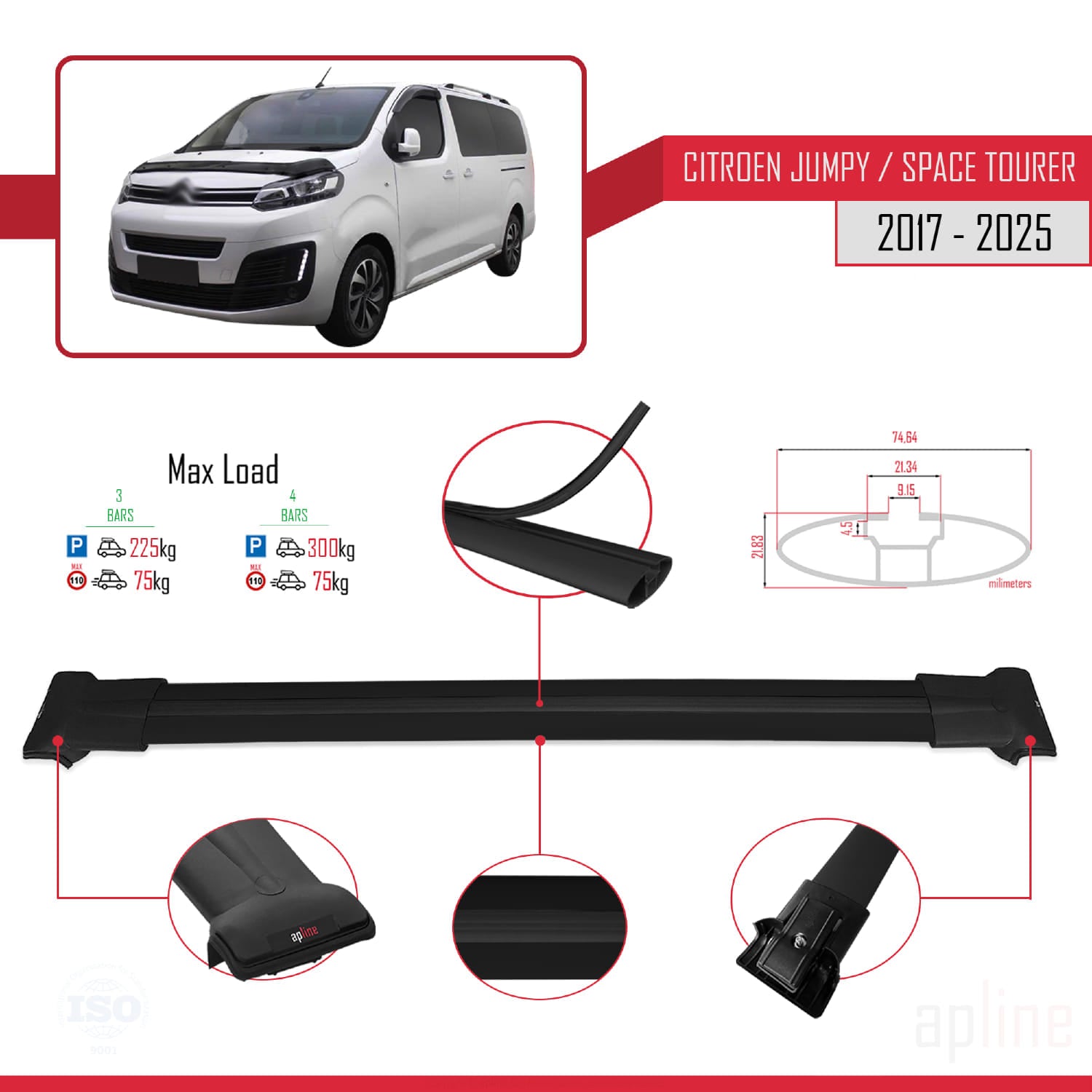 Kompatibel mit Citroen Jumpy 3 (K0) Space Tourer 2017-2025 FLY Modell Dachgepäckträger, schwarzes Aluminium, 3 Stangen