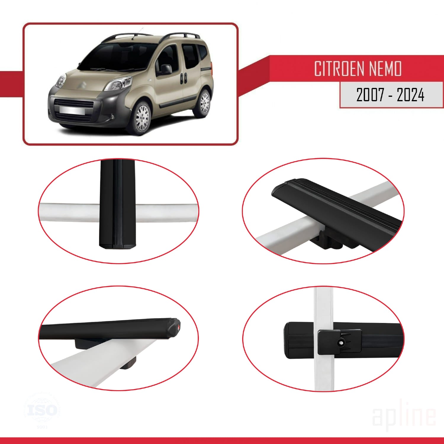Kompatibel mit Citroen Nemo 3 (225) 2007-2024 Basismodell Dachgepäckträger, schwarzes Aluminium, 2 Stangen