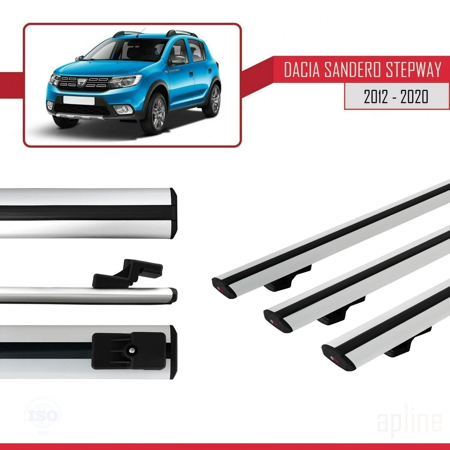 Kompatibel mit Dacia Sandero Stepway 2 2012-2020 Basismodell Dachgepäckträger, graues Aluminium, 3-Stangen