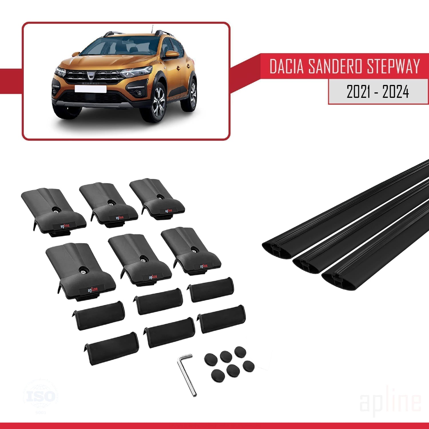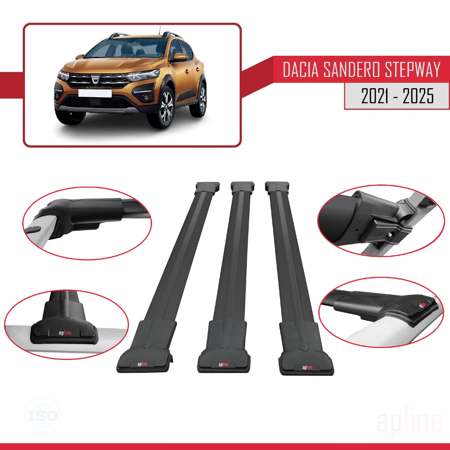 Kompatibel mit Dacia Sandero Stepway 3 2021-2025 FLY Modell Dachgepäckträger, Reling, Gepäckträger, schwarzes Aluminium, 3 Stangen