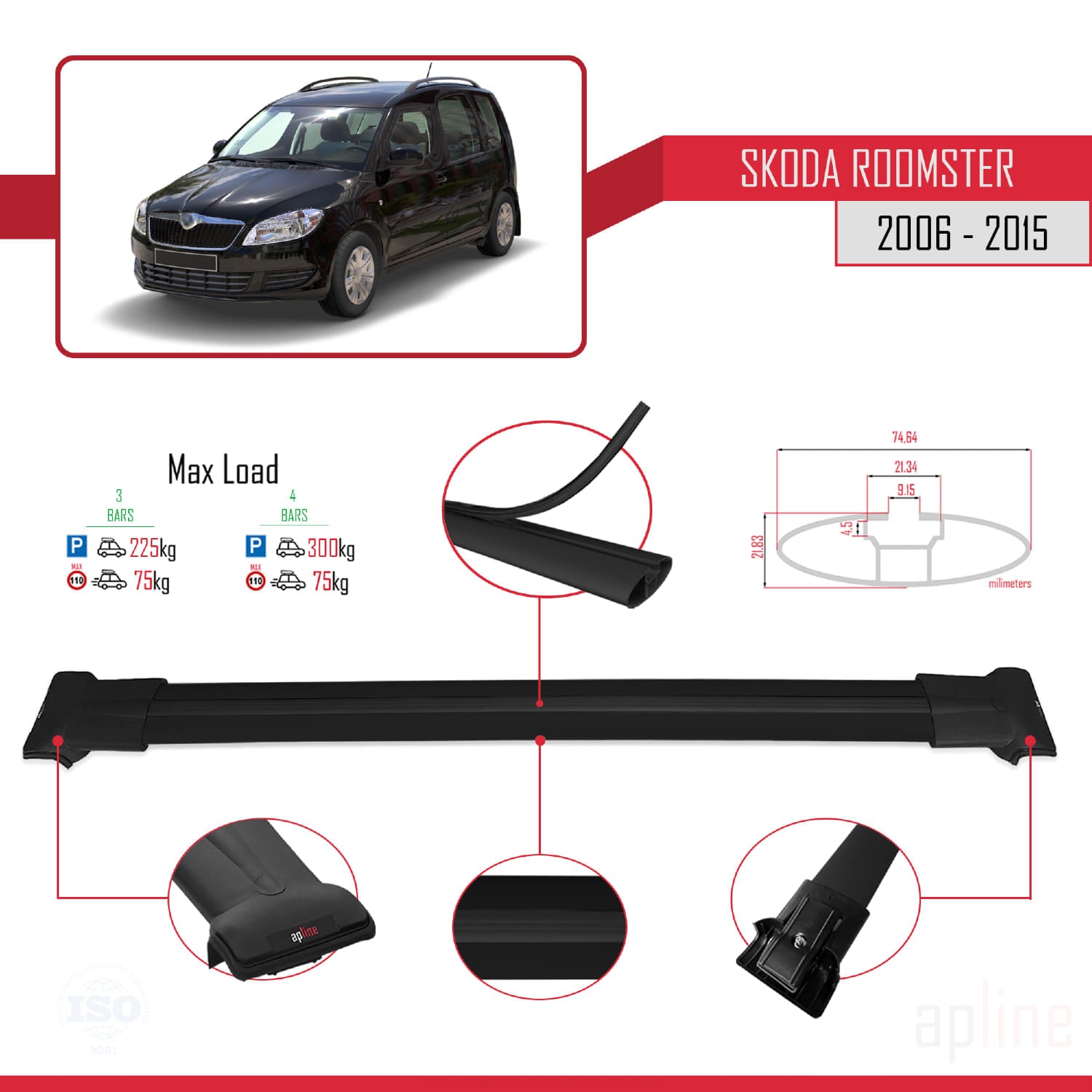 Compatible avec Skoda Roomster 2006-2015 FLY Model Barres de Toit Railing Porte-Bagages de Voiture Noir Aluminium 3 Barres